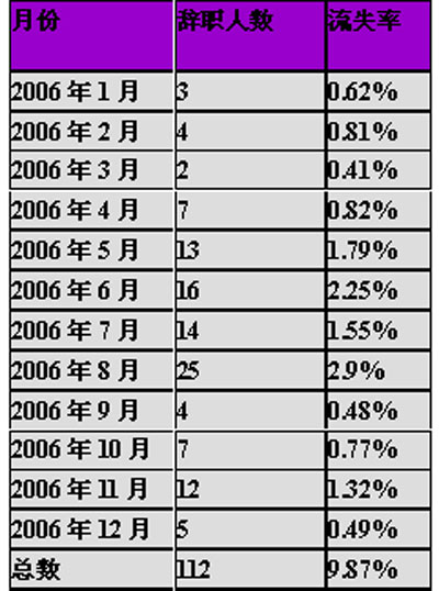在進(jìn)行收集、分析一些客服中心資料的過(guò)程中,與相關(guān)領(lǐng)導(dǎo)人員進(jìn)行較深入的思想碰撞,尤其是與中國(guó)移動(dòng)江蘇省客服中心副總經(jīng)理張立春的交流,尤為深刻。一組數(shù)據(jù)深深的震撼著我的思想,一是離職率2006年,僅為:9.87%,遠(yuǎn)遠(yuǎn)好于整個(gè)行業(yè)的平均水平;二是員工的心理健康和壓力狀況遠(yuǎn)遠(yuǎn)好于全國(guó)的平均水平;三是客戶服務(wù)質(zhì)量保持行業(yè)領(lǐng)先地位,各項(xiàng)指標(biāo)具體數(shù)值陳述如下。