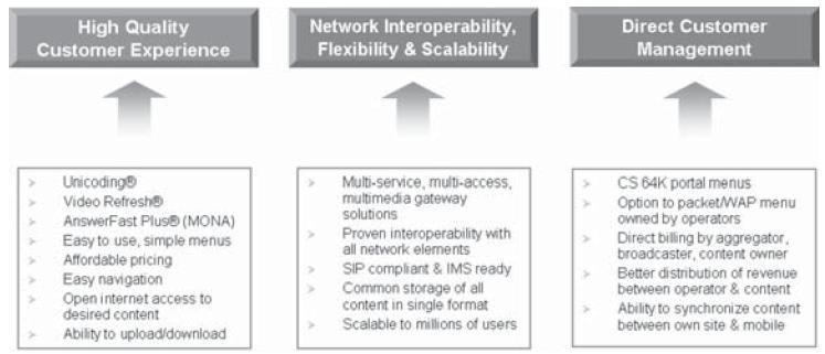 雖然視頻和多媒體服務(wù)的突然火熱對(duì)消費(fèi)者、企業(yè)和業(yè)界來(lái)說(shuō)都是件好事,但存在的挑戰(zhàn)還是很多,如怎樣提供高質(zhì)量的用戶(hù)體驗(yàn)、解決手機(jī)和網(wǎng)絡(luò)可互操作性問(wèn)題,以及集成商、廣播媒體和內(nèi)容提供商的直接用戶(hù)接觸與管理問(wèn)題。這些問(wèn)題的主要技術(shù)解決方案提供者有Unicoding、Video Refresh和AnswerFast Plus (MONA的一部分),同時(shí)多媒體網(wǎng)關(guān)解決方案也包括在內(nèi)。其它方面的可互操作性和用戶(hù)體驗(yàn)改善問(wèn)題很容易能解決,對(duì)今天現(xiàn)有的WAP服務(wù)是一種補(bǔ)充。