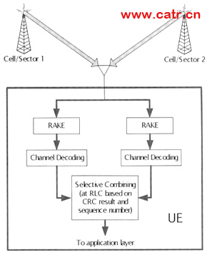當終端用戶移動到不同基站下的小區(qū)分界處時候,采用宏分集技術同時接收來自兩個基站的電視數(shù)據(jù)(見圖3)。在實現(xiàn)宏分集技術時,要求網(wǎng)絡側(cè)針對同一MBMS業(yè)務在兩小區(qū)間進行內(nèi)容同步和一定程度上的時間同步。