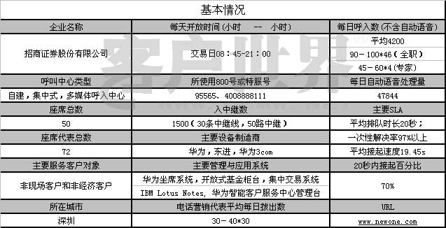 伴隨著招商證券業(yè)務(wù)種類的豐富、經(jīng)紀業(yè)務(wù)的迅猛發(fā)展,目前中心配備50名高素質(zhì)座席代表、日均受理電話量4200通、接通率保持在96%以上的規(guī)模與水平,并以全面的專業(yè)技能、優(yōu)質(zhì)標準化的服務(wù)在證券行業(yè)中已處于領(lǐng)先水平,引導(dǎo)了證券業(yè)內(nèi)經(jīng)紀業(yè)務(wù)電話服務(wù)的標準,在業(yè)內(nèi)及客戶群中樹立了良好的口碑,成為客戶和行業(yè)公認的楷模與標桿,促進了證券行業(yè)服務(wù)品質(zhì)的提升,引領(lǐng)了證券行業(yè)非現(xiàn)場服務(wù)的新潮流;改善了公司營業(yè)部現(xiàn)場服務(wù),無法完全滿足客戶日益增長的需求狀況,給客戶帶來了不錯的客戶體驗,為公司服務(wù)升級和業(yè)務(wù)發(fā)展提供了有力保障和支撐。