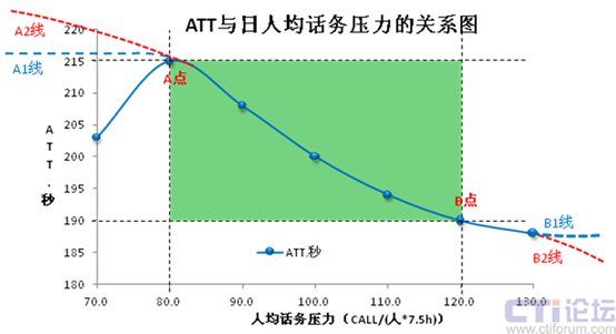 所以,在其它影響因素穩(wěn)定的情況下,當(dāng)人均話務(wù)壓力小于80或大于120的時候,ATT應(yīng)該保持在這兩個壓力點對應(yīng)的時長附近(即190~215秒,如A1和B1線走勢)我們暫且認為這是合理的波動范圍;若出現(xiàn)A2線走勢,浪費的必然是人員效率;若出現(xiàn)B2線走勢,犧牲的必然是服務(wù)質(zhì)量。