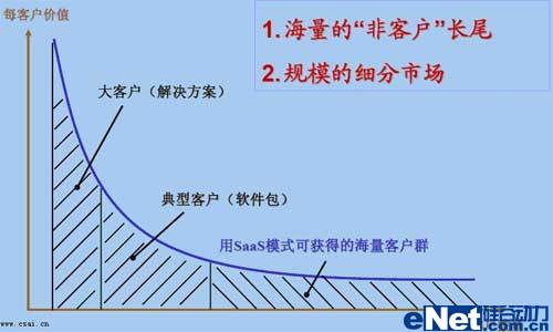 SaaS模式就是不論是什么樣的客戶都向其提供服務(wù),不論服務(wù)的時間長短,不論身處何地。傳統(tǒng)軟件是很難適應(yīng)普通客戶的,普通客戶付不出更多的投資,也不想軟件、硬件、服務(wù)都全面去投資,這樣就只有放棄使用軟件了。自然,軟件市場就少了一大群消費者。而SaaS模式將不細(xì)分客戶類型,讓人人都可使用軟件,讓個個都消費得起軟件?上攵,這是一個怎么龐大的市場。如下圖所示: