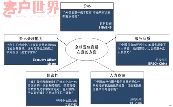 經(jīng)過研究,我們發(fā)現(xiàn)全球發(fā)包商最在意五個(gè)方面:價(jià)格、服務(wù)品質(zhì)、人力資源、保密性和咨詢處理能力。