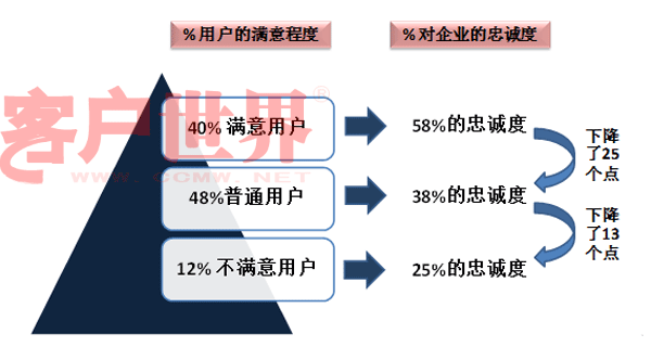 我們從圖中可以看到相比較滿意用戶,普通用戶對(duì)企業(yè)的忠誠(chéng)度就會(huì)下降25個(gè)點(diǎn),而不滿意用戶忠誠(chéng)度更是只剩下25個(gè)點(diǎn)。
