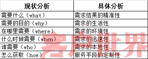 明辨客戶需求,是提升客戶體驗的基礎(chǔ)。目前很多語音搜索號碼大多根據(jù)客戶對業(yè)務(wù)需求的不同,推出了不同的專業(yè)延伸服務(wù),并取得了很好的成效。由于使用移動語音搜索的客戶在使用搜索時的環(huán)境、時間、地點有所不同,我們需要結(jié)合這些要素,對客戶需求進行深入分析,以保證呼叫中心能夠提供更好的客戶體驗。下文將采用5W1H分析法,對移動語音搜索時客戶需求的特點進行分析。