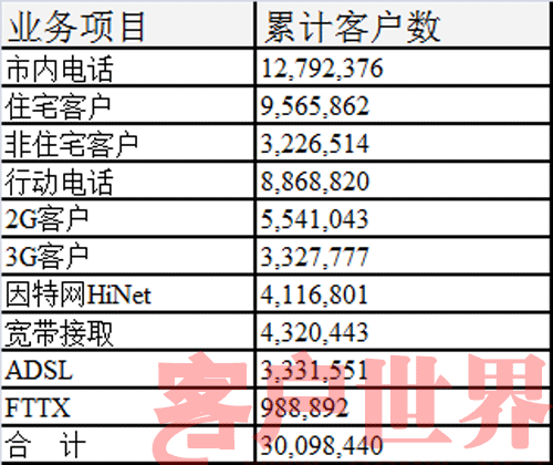 時(shí)至今日,臺(tái)灣中華電信在臺(tái)灣全區(qū)共有15個(gè)Call Center(含3個(gè)查號(hào)中心),共有3,000多位客服人員,服務(wù)本公司固網(wǎng)、行動(dòng)、數(shù)據(jù)、寬帶…等客戶約3,000余萬(wàn)戶。服務(wù)內(nèi)容包括咨詢、訂單、帳務(wù)、障礙、營(yíng)銷等作業(yè),每月平均受理及處理的話務(wù)量約1,230萬(wàn)余次。