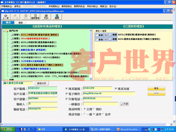 EFE第一步先將所有的窗口、文件與數(shù)據(jù)轉(zhuǎn)為電子化的檔案,當(dāng)需要傳送書(shū)面文件給客戶時(shí),客服人員可立即在在線點(diǎn)選以傳真或電子郵件將文件傳給客戶(如圖二),傳送成功后并立即以SMS通知客戶。當(dāng)客戶反饋數(shù)據(jù)回來(lái)時(shí),EFE會(huì)自動(dòng)接收并存盤(pán),接收成功后EFE則會(huì)立即發(fā)送SMS訊息給客戶安心,而且所有送出與接收文件都有完整記錄可共管理、追蹤與處理。