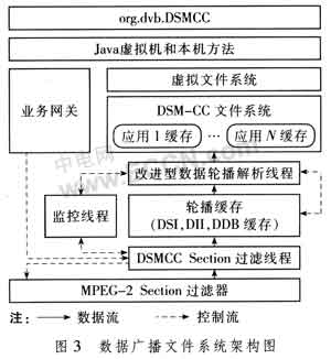 中間件的數(shù)據(jù)廣播文件系統(tǒng)主要負(fù)責(zé)裝載廣播應(yīng)用,是數(shù)據(jù)輪播協(xié)議在終端實(shí)現(xiàn)的核心模塊。圖3給出了基于改進(jìn)型數(shù)據(jù)輪播方案的數(shù)據(jù)廣播文件系統(tǒng)的架構(gòu)圖。相關(guān)Java功能在org.dvb.DSMCC包實(shí)現(xiàn),對(duì)應(yīng)中間件架構(gòu)的系統(tǒng)層部分。具體的功能實(shí)現(xiàn)位于核心層。 數(shù)據(jù)廣播文件系統(tǒng)的一個(gè)突出特點(diǎn)就是存在較大延時(shí),這對(duì)用戶快速切入啟動(dòng)交互應(yīng)用非常不利。為提高系統(tǒng)的執(zhí)行效率需要采取一些優(yōu)化措施。