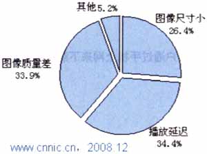 對(duì)于手機(jī)視頻用戶而言,目前最大的問題在于視頻圖像的播放延遲問題以及圖像質(zhì)量太差,兩者比例分別為 34.4%和33.9%。引起這兩種問題的最大因素是電信運(yùn)營商的網(wǎng)絡(luò)問題,目前的2.5G和2.75G網(wǎng)絡(luò)對(duì)于數(shù)據(jù)的快速傳輸仍有很大的瓶頸。