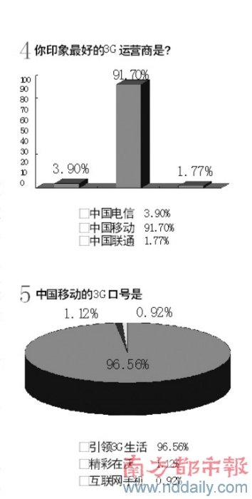 1、中國(guó)移動(dòng)的3G口號(hào)是?超過98%的被訪者選擇了“引領(lǐng)3G生活”這一正確選項(xiàng)。2、你是否考慮升級(jí)到3G手機(jī)?選擇“會(huì)升級(jí)”的接近80%。如果考慮升級(jí)到3G手機(jī),你最想使用哪家運(yùn)營(yíng)商的服務(wù)?中國(guó)移動(dòng)奪得了超過九成的選票。但當(dāng)最后問到,“你印象中,中國(guó)移動(dòng)的3G標(biāo)準(zhǔn)是?”時(shí),正確選項(xiàng)T D -SCD M A的得票率竟只有三成左右。