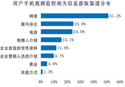 另一方面,運營商的宣傳不到位。從諾達咨詢調(diào)查數(shù)據(jù)來看,用戶目前獲得手機視頻監(jiān)控相關(guān)信息的主要渠道是互聯(lián)網(wǎng),有51%的用戶是通過互聯(lián)網(wǎng)了解手機視頻監(jiān)控的,而從傳統(tǒng)的電視媒體和報刊雜志獲得相關(guān)信息的用戶僅僅約各占24%,通過相關(guān)手機視頻監(jiān)控企業(yè)發(fā)放宣傳資料和介紹獲取相關(guān)信息的用戶各占12%和10%。由此可見,手機視頻監(jiān)控的宣傳尚不到位,導致消費者不能通過多方渠道獲取相關(guān)信息。