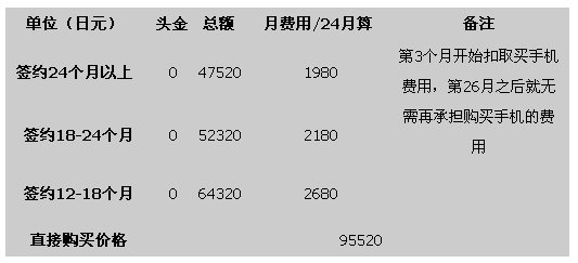 我們都知道日本的購(gòu)買手機(jī)最主要是和運(yùn)營(yíng)商簽約購(gòu)買,我們以夏普2009年夏季最新款手機(jī)Soft Bank 933SH為例,來說明一下在日本購(gòu)買手機(jī)的成本?偟膩碚f,就是簽約時(shí)間越長(zhǎng),購(gòu)買手機(jī)價(jià)格越低,簽約時(shí)間越短,購(gòu)買價(jià)格越高。