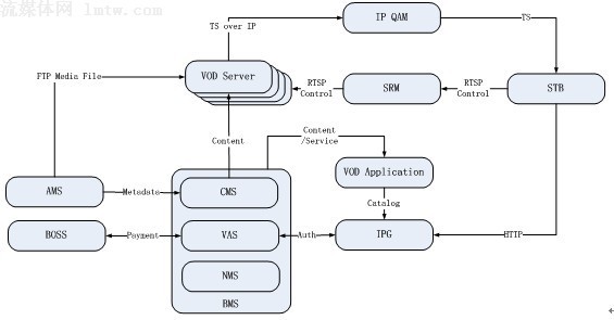 QAM則是網(wǎng)絡(luò)設(shè)備產(chǎn)品,因此交互平臺(tái)架構(gòu)的核心組成包括:視頻服務(wù)系統(tǒng)VOD Server、業(yè)務(wù)管理系統(tǒng)BMS、會(huì)話和資源管理系統(tǒng)SRM、應(yīng)用管理系統(tǒng)VOD