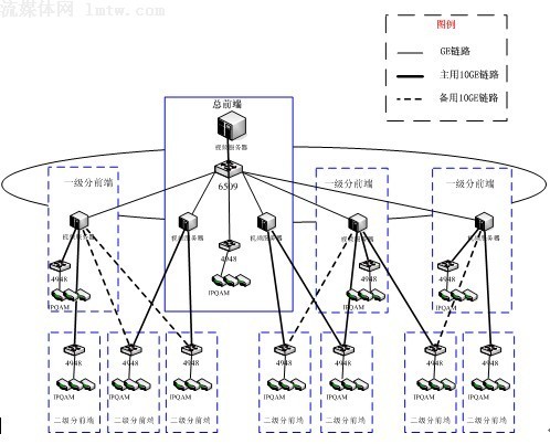 方案二:全集中式。在總前端集中部署若干臺(tái)視頻服務(wù)器,通過(guò)萬(wàn)兆網(wǎng)絡(luò)直接向各分前端提供視頻流服務(wù);示意圖如下: