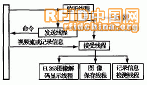 在軟件設(shè)計方面包括兩部分,一部分是監(jiān)控終端的監(jiān)控軟件,另一部分是各便件的底層軟件。監(jiān)控終端采用了多線程的軟件設(shè)計方法,系統(tǒng)對連接的每一個監(jiān)控點(diǎn)共采用了6個線程,即網(wǎng)絡(luò)監(jiān)聽線程、發(fā)送線程、接受線程、H.26 3圖像解碼顯示線程、圖像保存線程和記錄信息(門口終端的撥號、門禁一卡通等記錄信息)檢測線程,如圖4所示。