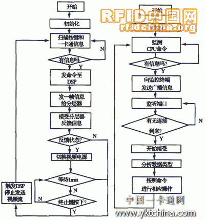 對于底層軟件,主要是門口終端的控制軟件,其工作流程如圖5所示。門口終端上電后,先進(jìn)行初始化工作,然后開始掃描按鍵和一卡通信息,當(dāng)確認(rèn)有變化時,微處理器CPU l先給分層器發(fā)送一幀信息,并且監(jiān)聽分層器的反饋信息,同時啟動DSP通過網(wǎng)絡(luò)端口發(fā)送廣播消息給監(jiān)控終端,以便啟動監(jiān)控終端的接受線程接受視頻流和訪問信息或一卡通信息。當(dāng)時間超過l min或終止鍵按下時,雙方終止通信,門口終端與監(jiān)控終端之間由CPU1觸發(fā)DSP中斷,使其停止發(fā)送視頻流數(shù)據(jù)。