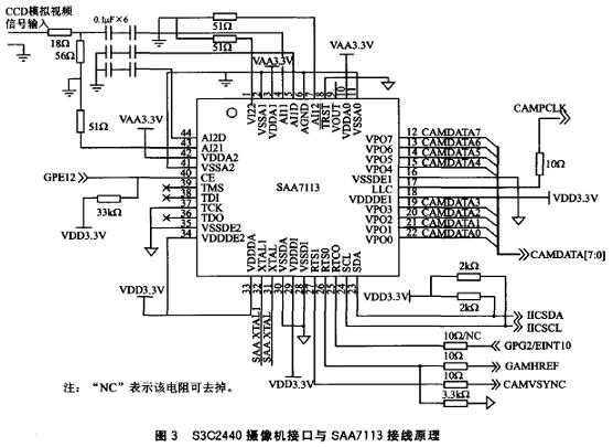 4:2:2格式。對(duì)SAA7113初始化需要通過I2C 總線進(jìn)行,而S3C2440內(nèi)部集成的I2C控制器正好可以實(shí)現(xiàn)這個(gè)過程。S3C2440的攝像機(jī)接口與SAA7113的連接原理如圖3所示。