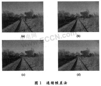 綜合考慮以上四種背景提取方法,本文采用結合多幀圖像平均法和連續(xù)幀差法這兩種方法來進行視頻序列背景的提取。考慮到運動目標的多樣性,有目標經(jīng)過視場而引起的變化長時間內(nèi)可忽略不計。多幀圖像平均法時將運動目標看作為噪聲,用累加平均的方法消除噪聲,利用目標運行一段時間的序列圖像進行平均而得到視場背景圖像。連續(xù)幀差算法是通過當前幀的圖像與前一幀圖像的差值找到運動區(qū)域,對運動區(qū)域的背景保持不變,而非運動區(qū)域的背景則用當前幀進行更新,經(jīng)過一段時間的迭代便可提取出背景。兩種方法的結合可以很好地彌補各自的缺點,能夠適應鐵路沿線周邊環(huán)境的要求,對存在運動目標的背景能夠提取出質量較高的背景圖像。具體過程如下: