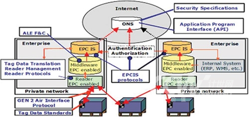 EPCglobal提出了Auto-ID系統(tǒng)的五大技術組成,分別是EPC(電子產(chǎn)品碼)標簽、RFID標簽閱讀器、ALE中間件實現(xiàn)信息的過濾和采集、EPCIS信息服務系統(tǒng),以及信息發(fā)現(xiàn)服務(包括ONS和PML)。由于從一開始就讓世界各大洲的從業(yè)人員充分參與,EPCGlobal標準(架構(gòu)圖如下)得到了較廣泛認同,這里不再對其標準體系架構(gòu)贅述。
