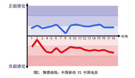 圖2的情感曲線分別是中國移動的“喜愛”情感曲線和中國電信的“討厭”情感曲線,對應(yīng)于雙方整個呼入電話體驗18個子流程上的情感感受。(注意,我們只列出了中國移動的“喜愛”曲線和中國電信的“討厭”曲線來舉例說明。)