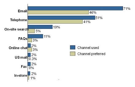 正是基于這一點(diǎn)供應(yīng)商們紛紛加入PeopleSupport的陣營,并且在這之后不久統(tǒng)一的排隊(duì)技術(shù)就問世了,更在之后發(fā)展成全面集成的聯(lián)絡(luò)中心解決方案和eCRM套件。這些系統(tǒng)允許聯(lián)絡(luò)中心將電話流與交談、電子郵件、郵寄信件和傳真混合起來,現(xiàn)在,SMS也來了。Forrester調(diào)研機(jī)構(gòu)2005年進(jìn)行了一個(gè)調(diào)研,意在檢測客戶偏愛的聯(lián)絡(luò)渠道有哪些以及他們實(shí)際使用的渠道又是哪些。該調(diào)研貫穿全美所有類型的企業(yè)(并不局限于電子零售商或DOT.COM們)