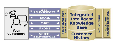 Technologies”是一家非常著名的多接觸點(diǎn)呼叫中心供應(yīng)商,這家公司建議采用“通用事故”追蹤機(jī)制,它強(qiáng)調(diào)報(bào)表和歷史紀(jì)錄必須作為任何一個(gè)多接觸點(diǎn)聯(lián)絡(luò)中心不可或缺的組成部分!癛ightnow”提供的以下插圖很清楚地向我們展示了多渠道知識庫集成是如何被強(qiáng)制執(zhí)行的。
