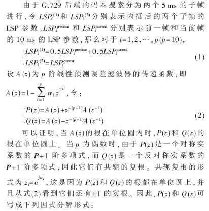 直接從G.729 編碼流中按照量化算法解量化可以得到LSP參數(shù)。由于后段的說(shuō)話(huà)人識(shí)別系統(tǒng)還需要激勵(lì)參數(shù),而在激勵(lì)參數(shù)的計(jì)算過(guò)程中經(jīng)過(guò)了LSP的插值平滑,所以為了使特征矢量中聲道和激勵(lì)參數(shù)能準(zhǔn)確地對(duì)應(yīng)起來(lái),要對(duì)解量化的LSP參數(shù)采用插值平滑。