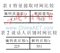 表1為特征提取時(shí)間比較結(jié)果,表2為說(shuō)話(huà)人識(shí)別時(shí)間比較結(jié)果。
