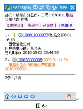 新工單到達時,手機會以震動和鈴聲提醒。對于“分公司工單-待辦工單”中超過30分鐘(可設定)無人接收受理的工單,用紅色進行標識;對于“我的工單-待辦工單”中超過3小時(可設定)未處理的工單,用紅色標識;對于“分公司工單-辦結工單”和“我的工單-辦結工單”中超時完成的工單,用紅色進行標識。