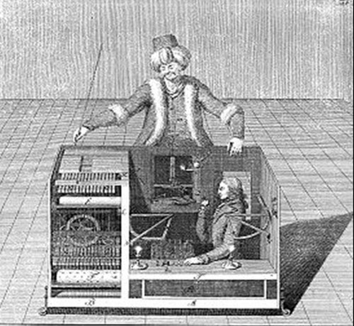 這個名字源自于臭名遠(yuǎn)揚(yáng)的能下象棋的“自動裝置”,它是匈牙利男爵沃爾夫?qū)ゑT·肯佩倫(Wolfgang Von Kempelen)1770年建造的。這個木制機(jī)器外形像一個坐在大機(jī)箱前的土耳其魔法師,它能自動而快速地下象棋,用復(fù)雜的齒輪和杠桿系統(tǒng)來移動棋子。在維也納皇宮的首次表演中,它就迅速擊敗了對手Cobenzl伯爵,讓在場的皇室成員看得十分高興。從此關(guān)于這個驚人聰明的機(jī)器人迅速聞名于世,于是肯佩倫帶著它在歐洲各地表演,擊敗了一系列著名的挑戰(zhàn)者,包括拿破侖和本杰明·富蘭克林。直到幾年之后,這個騙局才被揭穿。原來機(jī)箱里藏了一名象棋大師,他用一個磁鐵系統(tǒng)來跟蹤對手的舉動并移動自己的棋子,這個人實(shí)際是在模擬一種人工智能。(摘錄自 比特云 )