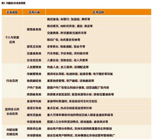 傳統(tǒng)LBS應(yīng)用主要是緊急呼叫、車輛導(dǎo)航、物流管理、人員定位等,其實(shí)LBS作為一種基本能力,可以擴(kuò)展到各類業(yè)務(wù)應(yīng)用中。根據(jù)面向的服務(wù)對象的不同,LBS業(yè)務(wù)可以分為個(gè)人與家庭應(yīng)用、行業(yè)應(yīng)用、政府與公共安全應(yīng)用和運(yùn)營商內(nèi)部運(yùn)營支撐應(yīng)用四大類型。每種LBS業(yè)務(wù)類型都包括各類豐富應(yīng)用(如表1),這里僅列舉部分應(yīng)用進(jìn)行簡要探討。