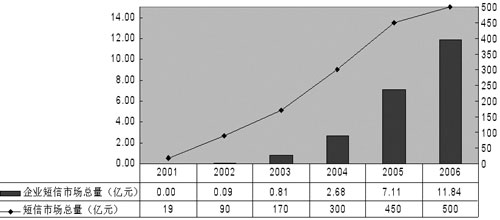 有數(shù)據(jù)顯示,2002年企業(yè)短信市場(chǎng)總量為0.09億元,2003年增長(zhǎng)到0.81億元,預(yù)計(jì)2006年將突破10億元。終于,中國(guó)移動(dòng)和中國(guó)聯(lián)通先后推出了面向企業(yè)用戶的“集團(tuán)短信”業(yè)務(wù),運(yùn)營(yíng)商對(duì)這個(gè)市場(chǎng)的重視使得一個(gè)新的產(chǎn)業(yè)鏈逐步完善起來(lái),短信也開始“潤(rùn)物細(xì)無(wú)聲”地改變著國(guó)內(nèi)企業(yè)的一些習(xí)慣。