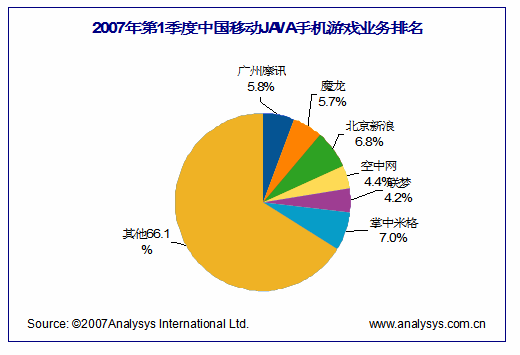 從企業(yè)實(shí)力和市場份額來看,目前手機(jī)游戲市場主要有三股力量組成,以空中等為代表的全業(yè)務(wù)線電信增值服務(wù)商(SP),以新浪等為代表的互聯(lián)網(wǎng)門戶綜合服務(wù)商,以米格、魔龍為代表的專業(yè)手機(jī)游戲產(chǎn)品與服務(wù)提供商(SP)。根據(jù)中國移動(dòng)“百寶箱”第1季度收入數(shù)據(jù),易觀注意到,掌中米格、北京新浪、廣州摩訊位列前三,前三名占據(jù)了近20%的市場份額。夢網(wǎng)手機(jī)游戲精品業(yè)務(wù)的三家服務(wù)提供商第一季度收入排名為:米格、新浪、空中網(wǎng)!