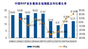中國WAP業(yè)務(wù)整體市場規(guī)模及環(huán)比增長率(來源:易觀國際)