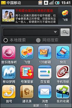 在第一屏的上端,是中國移動的“快訊”欄目條和飛信登錄框,這讓整個手機看上去極具“中國移動特色”,“快訊”和“飛信”的下面是Google的搜索框,搜索框有兩個選擇,分別是本地搜索和網(wǎng)路搜索。
