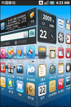 由于OMS是在基于Linux的Andriod系統(tǒng)基礎上,針對中國市場需求以及中國移動的自有業(yè)務所做的修改,OMS操作系統(tǒng)看上去第一直觀感受仍然是與iPhone界面和T-Mobile推出的第一款Andriod手機“Gphone”界面非常相似。