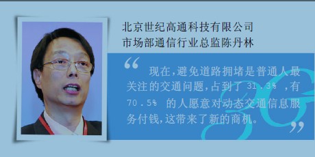 在北京世紀(jì)高通科技有限公司市場部通信行業(yè)總監(jiān)陳丹林看來,交通堵塞已經(jīng)成為現(xiàn)代都市的頑疾,而3G的到來給這一問題的解決帶來了新的思路。