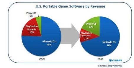 談到便攜游戲機(jī)市場,數(shù)據(jù)更加驚人。蘋果公司的iPhone 和iPod Touch 在制定對抗索尼公司的PSP和任天堂DS的決策。iPhone OS上能運(yùn)行的游戲收入在2008年只占到便攜游戲收入的5%,而2009年增長到了19%。iPhone OS操作系統(tǒng)分別從PSP和任天堂DS奪走了9個(gè)點(diǎn)和5個(gè)點(diǎn)的軟件收入市場份額,并且正在逐漸占領(lǐng)整個(gè)便攜式游戲市場。