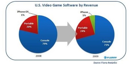 相對于全美游戲機(jī)及便攜游戲市場來說,iPhone/iPod Touch占游戲銷售總額的5%。(此數(shù)字包含了如PlayStation和Xbox之類的游戲機(jī)銷售額,但不包括網(wǎng)游和社交游戲)據(jù)Flurry公司數(shù)據(jù)顯示,2009年游戲銷售額占蘋果公司應(yīng)用程序總收入13.6億美元的37%。