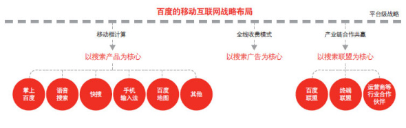 百度無(wú)線的戰(zhàn)略仍將以搜索作為核心。“百度在無(wú)線方面的核心發(fā)展規(guī)劃就三條:第一條,以搜索產(chǎn)品為核心布局移動(dòng)框計(jì)算。第二條,以搜索廣告位核心,探索全線收費(fèi)模式。第三條,以搜索聯(lián)盟為核心,推動(dòng)產(chǎn)業(yè)鏈合作共贏!边@是百度的官方說(shuō)法。