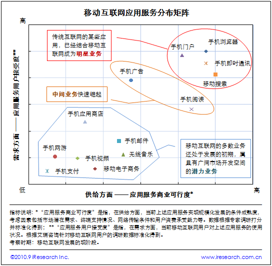 根據(jù)艾瑞咨詢近期發(fā)布的《2009-2010年中國(guó)移動(dòng)互聯(lián)網(wǎng)行業(yè)發(fā)展報(bào)告》,移動(dòng)互聯(lián)網(wǎng)各應(yīng)用服務(wù)在“應(yīng)用服務(wù)商業(yè)可行度”和“應(yīng)用服務(wù)用戶接受度”兩個(gè)維度上被劃分為“明星業(yè)務(wù)”、“中間業(yè)務(wù)”和“潛力業(yè)務(wù)”三個(gè)類型。具備一定規(guī)模化發(fā)展市場(chǎng)條件,但還面臨若干限制因素的移動(dòng)互聯(lián)網(wǎng)業(yè)務(wù),將在未來逐步打開市場(chǎng)。