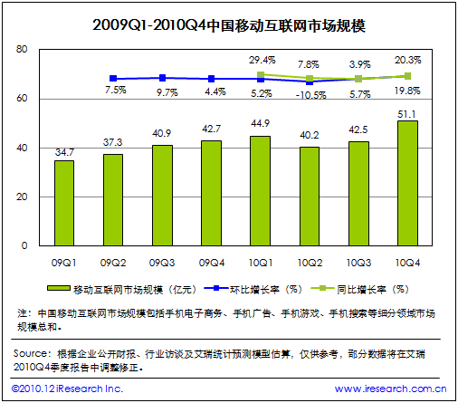 根據(jù)艾瑞咨詢即將發(fā)布的2010年第四季度中國移動互聯(lián)網(wǎng)市場監(jiān)測數(shù)據(jù)顯示,2010Q4中國移動互聯(lián)網(wǎng)市場整體規(guī)模達到51.1億,同比增長19.8%,環(huán)比增長20.3%。艾瑞咨詢分析認為,本季度電信運營商對計費通道治理開始收尾,移動增值市場整體復蘇。同時手機電子商務、手機游戲業(yè)務領域取得良好市場表現(xiàn),受手機應用商店、位置簽到服務等新型手機業(yè)務創(chuàng)新的帶動,移動互聯(lián)網(wǎng)規(guī)?傮w攀升,投融資比重增加。