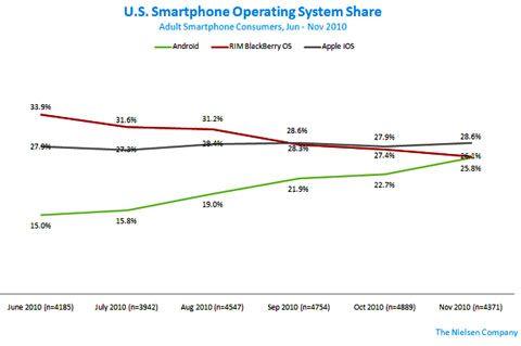 北京時(shí)間1月4日早間消息,市場(chǎng)研究公司尼爾森周一發(fā)布的報(bào)告顯示,在美國(guó)智能手機(jī)市場(chǎng),蘋果的iOS的份額仍然排名首位,市場(chǎng)占有率為28.6%。