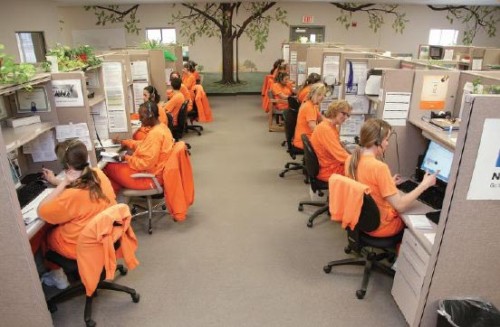 但古德溫邁出了回歸體面人生的艱難步伐,并已獲得了一份工作,4月份刑滿后可上任,這一切都多虧了一家名為威爾帝電信(Televerde)的公司。該公司在佩里維爾監(jiān)獄運(yùn)營著四個(gè)呼叫中心,包括250名輪候上班的身著橘黃色連身衣的“女士”(員工們很享受這個(gè)稱呼),員工必須接受脫衣搜查,有時(shí)還要接受保安的盤問。但一旦戴上耳機(jī),她們就進(jìn)入了另一個(gè)世界!霸谀抢锟梢灾厥白宰。”古德溫表示,她已為出獄后的生活攢下了8,000美元的儲(chǔ)蓄。威爾帝電信是一家私營企業(yè),董事長詹姆斯·胡克(James