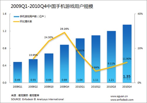 另外,從手機(jī)游戲用戶規(guī)模來看,2010年第4季度中國手機(jī)游戲用戶數(shù)量達(dá)到了1.35億,環(huán)比增長11.9%。