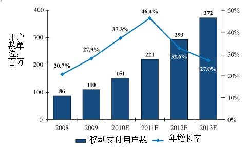 基于“中國計(jì)算機(jī)世界”的研究預(yù)測(cè),中國移動(dòng)支付用戶在2009年底達(dá)到1.1億,預(yù)計(jì)將在2013年超過3倍。由于需求大幅提高,電信運(yùn)營(yíng)商會(huì)繼續(xù)在每個(gè)省推出移動(dòng)支付解決方案網(wǎng)絡(luò)。反過來,也會(huì)刺激第三方平臺(tái)和供應(yīng)商的發(fā)展。