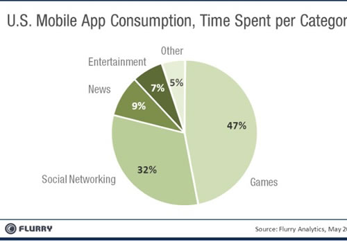 Flurry研究了不同應(yīng)用類別占用時間。通過對2011年5月份超過8.5萬個應(yīng)用數(shù)據(jù)的抓取,得到如圖數(shù)據(jù):