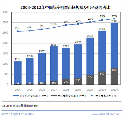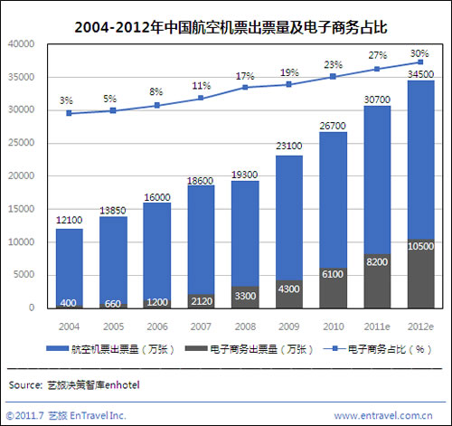 出票量方面,2011年上半年中國航空市場通過電子商務渠道的出票量約3900萬張,航空市場出票量為1.4億張,電子商務渠道占整體出票量的28%。隨著第三季度航空市場進入旺季,需求將帶動出票量強勢上升。藝旅咨詢預測2011年中國航空機票電子商務出票量將達8200萬張。