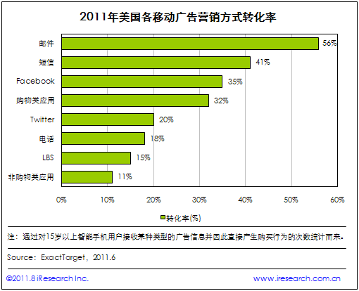 iResearch艾瑞咨詢整理ExactTarget調研數(shù)據(jù)時發(fā)現(xiàn):2011年在驅動美國手機用戶產(chǎn)生購買的移動廣告營銷方式中,電子郵件營銷的轉化率最高,達到56%,短信、Facebook、購物類手機應用(如Amazon、eBay、Groupon)以41%、35%、32%的轉化率依次位居二、三、四位。