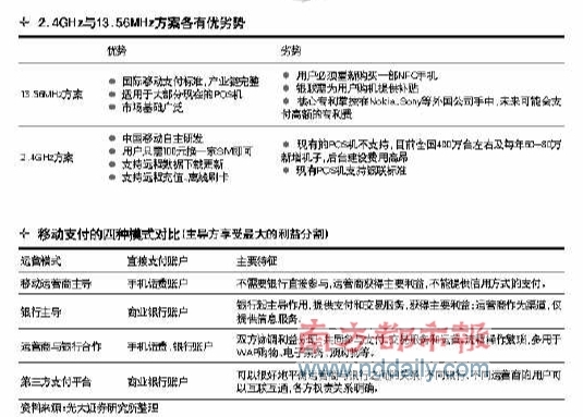 對(duì)此,國金證券發(fā)布了一份研究報(bào)告稱,相對(duì)于13 .56MHz方案而言,2.4GHz方案在推廣上有先天的優(yōu)勢(shì)。畢竟13.56M H z方案必須對(duì)手機(jī)重新設(shè)計(jì),需要等待手機(jī)產(chǎn)業(yè)鏈對(duì)13.56M H z的逐步支持,時(shí)間周期較長;同時(shí),更換13.56M H z手機(jī)帶來的重置成本無論是由用戶承擔(dān)還是由運(yùn)營商承擔(dān)都是一筆高額的費(fèi)用,推廣難度較高。而2.4G H z方案僅需更換SIM卡便可完成對(duì)手機(jī)的改造,不用等待終端產(chǎn)業(yè)鏈的成熟;同時(shí)改造成本低,便于運(yùn)營商進(jìn)行促銷推廣。